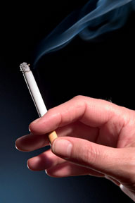 The two biggest problems with cigarette smoking are nicotine and carbon monoxide. In addition to the addictive properties of nicotine, the chemical affects arteries throughout the body. As a stimulant, nicotine speeds up the heart by about 20 beats per minute with every cigarette. It raises blood pressure, is a vasoconstrictor -- which means it makes arteries all over the body become smaller, making it harder for the heart to pump through the constricted arteries -- and it causes the body to release its stores of fat and cholesterol into the blood.
